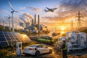 O sector dos transportes rodoviário, aéreo e marítimo apresenta desafios específicos devido às elevadas densidades energéticas exigidas. A electrificação dos veículos ligeiros tem avançado rapidamente, impulsionada por políticas públicas e pela procura dos consumidores, e em 2026 vários mercados ultrapassaram 30% de vendas de veículos eléctricos. No entanto, descarbonizar quase totalmente a frota mundial até 2026 exigiria substituir centenas de milhões de veículos num prazo irrealista. Nos transportes pesados, aviação e transporte marítimo, a dependência de combustíveis fósseis permanece dominante. Os combustíveis sustentáveis de aviação (SAF) e os combustíveis marítimos de base renovável, como o hidrogénio ou a amónia verde, continuam a ter produção limitada e custos elevados. Mesmo com o aumento da capacidade observado em 2025-2026, a sua adopção massiva continua inviável num horizonte tão curto. Assim, até Março de 2026, o foco global permanece na expansão de projectos-piloto, no reforço regulatório e na criação de cadeias de abastecimento, e não numa substituição total do sector.